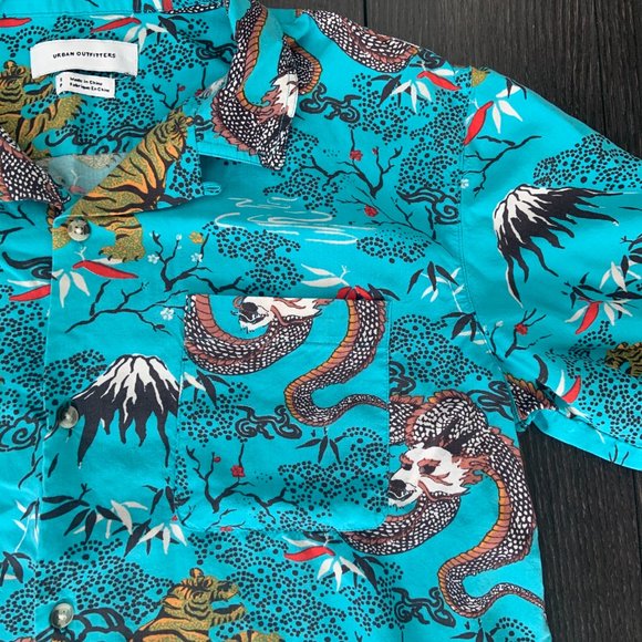 ~ Urban Outfitters, Turquoise Blue Unisex Tiger Print Short Sleeved Collared Button Down, super soft, and relaxed fit, white and brown buttons,