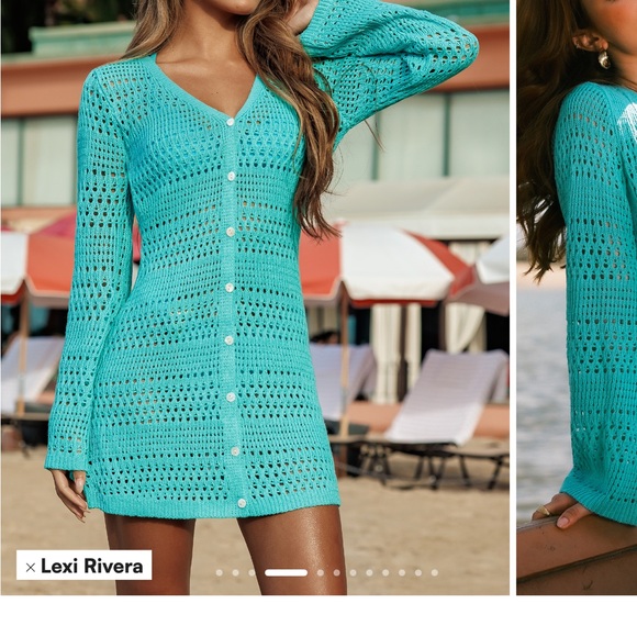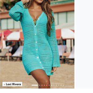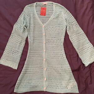 Stylish mint crochet cover-up with button-up design. Perfect for beach days.