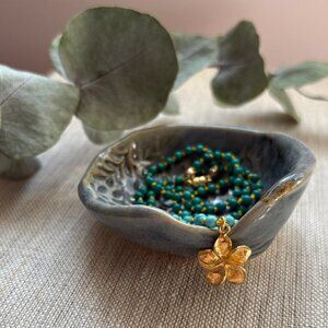 This real turquoise hand knotted necklace is lightweight and so comfortable to wear. Almost 100 turquoise stones in two shades of blue are strung onto yellow silk cord, creating a pretty necklace that looks great alone or layered with other chains. A tiny knot separates each stone, which results in a beautiful drape. The stones are about 3mm in diameter. At the center is a gold vermeil plumeria flower charm. I love the detail and shine of this pretty charm. A small gold filled magnetic clasp secures the necklace.