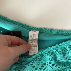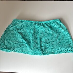 Stylish turquoise lace bikini set. Features a halter top and matching skirt.