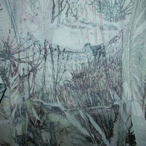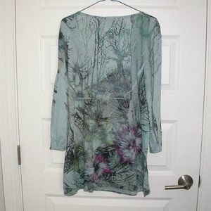Turquoise printed light summer tunic - long gathered cuff sleeves - smocked chest - 21" pit to pit, 30" shoulder to hem