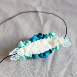 Handmade headband with 3 ribbon flowers in coordinating colours of turquoise/teal. Faux pearl bead in the centre of each flower & lace leaves on each end. Stitched onto a cream coloured felt backing. Attached to a round elastic band for comfort. The elastic can easily be hidden in your hair & the flowers can be worn on the side of your head or with the flower at the back with an updo style.