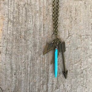The warm combination of antique brass and turquoise evokes a vintage bohemian feel. Featuring a turquoise stone spike, antique brass wing, arrowhead charm and an arrow pendant. Making this a great layering necklace to help you achieve your masculine boho look.
