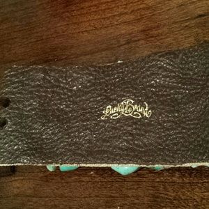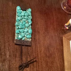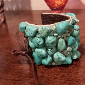 This is a beautiful turquoise and leather bracelet I bought at Macy's a couple years ago. It adds a pop of color to any outfit!!! There is no flaws, no loose stones, no scratches in the leather. It really is such an amazing piece, I always got compliments when I wore it!!!