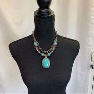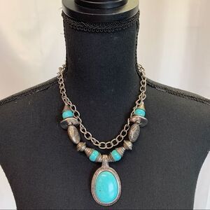 Turquoise coloured bohemian tribal native layered Silvertone chunky statement necklace