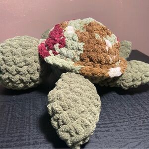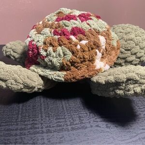 Handmade Crochet Turtle with Small Safety Eyes and a multi colour shell.