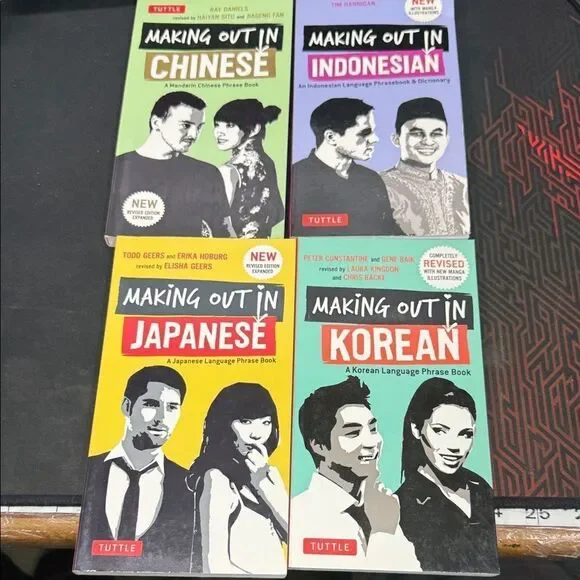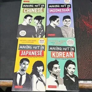 Set of four Tuttle language phrase books: Chinese, Indonesian, Japanese, and Korean. Perfect for language learners.