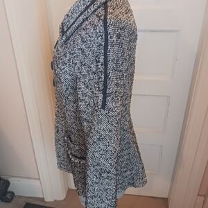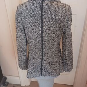 Wool and acrylic fitted tweed jacket with patch pockets, raw edge detail, leatherette buttons, black tape detail. sized small. shoulder to hem 28 inches. width at underarm 18 inches. width at waist 16 inches. Dropped sleeve construction from collar seam to cuff 27 inches. There are belts loops but no belt. Unlined. Made in France. Tage size says "L" but fits small.