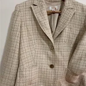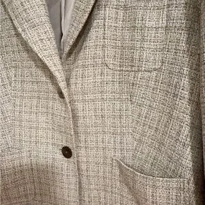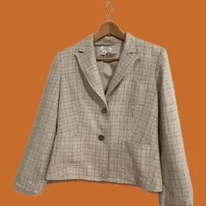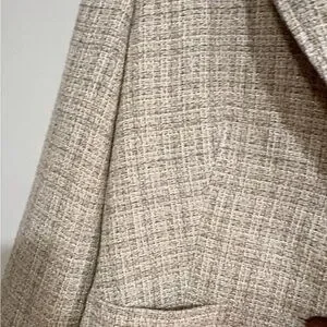 Elevate your style with this elegant beige tweed jacket. Perfect for any occasion, this jacket offers a sophisticated look with its classic design.