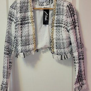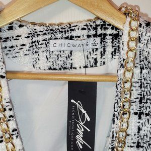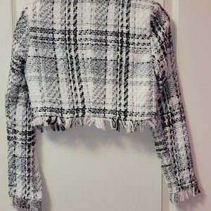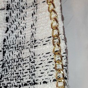 Tweed jacket with high waisted shorts, 14 inches from shoulder to shoulder, 14 inches from top to bottom, 13 inches top of shorts, 13 inches from top to bottom of shorts. 100 % Polyester, Made in China. The shoulders of the jacket are not lined, the tweed can be itchy.