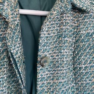 Lovely blue and cream tweedy spring coat. Bought in London. Is in good used condition but does show some wear on sleeves and shoulder (from where purse sits). unfortunately too small for me now. Perfect for spring!