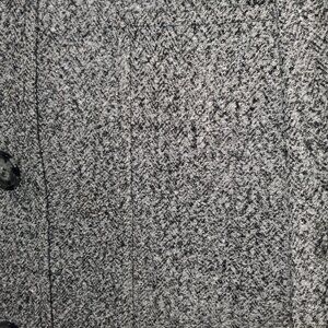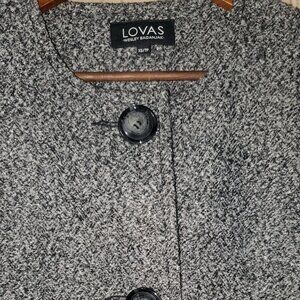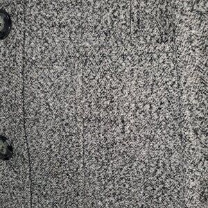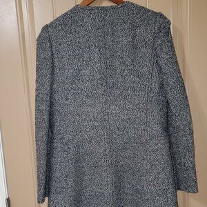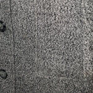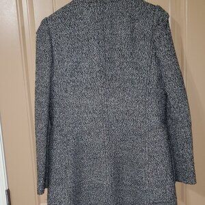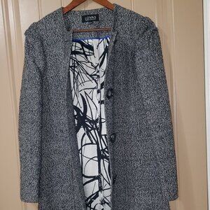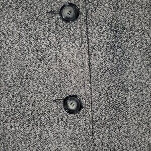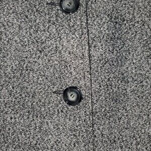 This is an absolutely beautiful below the knee length jacket. It does not have a collar so it is beautiful with a scarf. The lining is black and white and stunning. There are 2 large square pockets on the sides, button closure. This was my go to coat when going into the office with a blouse and skirt. It is in excellent used condition.