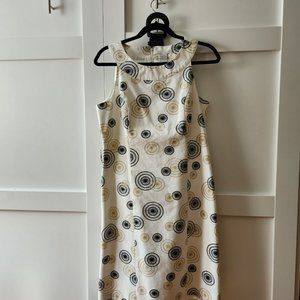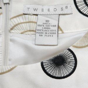 Tweeds size 10 dress. Tan and black designs on a white background with a black faux patent and elastic belt.