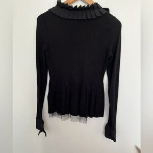 Elegant black cardigan with ruffled collar. Features a zip-up front and sheer hem detail. Perfect for layering. Like new size XS