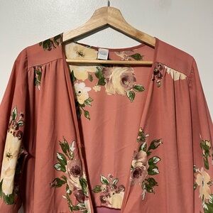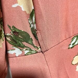 • Color: Pinkish rust with floral print (cream, burgundy, and green tones)