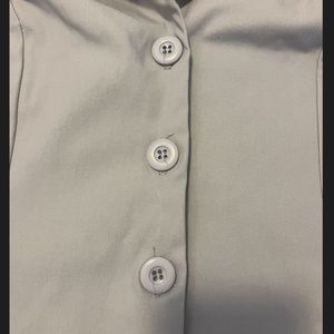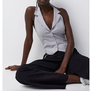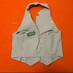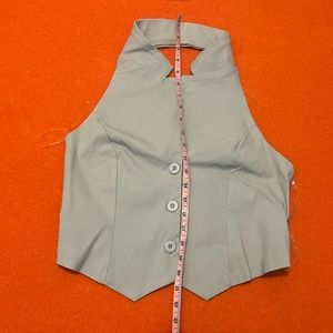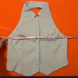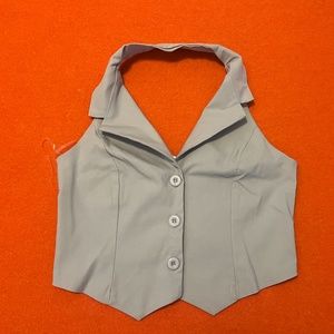 Stylish light gray crop top. Features button-up front. Sleeveless with a chic collar.