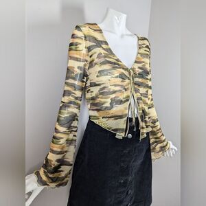 Twik Sheer Mesh Tie Front Long Sleeve Camo Crop Top Size Medium