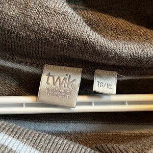 This is a woman's Twik's Turtleneck sweater. It has buttons in the front that go down to about the chest area. It is a grey and light blue stripped long sleeve sweater. Only worn twice and not itchy.