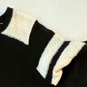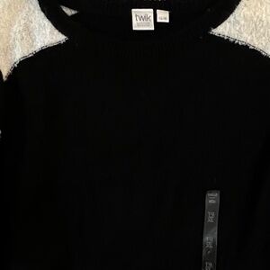 NWT twik sweater from Simon’s in women’s size XL. Lightweight black wool-blend pullover crew neck sweater features contrasting white shoulders and white double stripes that pop out in a soft fuzzy knit that also contrasts with the finer knit of the sweater. A versatile top that can mix with several styles - fun enough to be sporty casual and refined enough to be dress up for business casual.