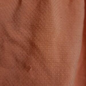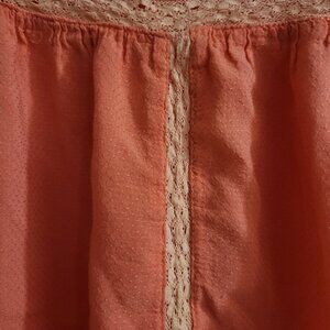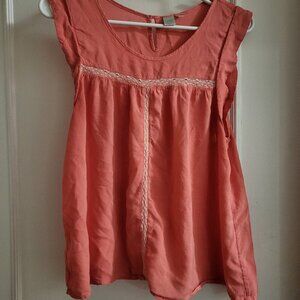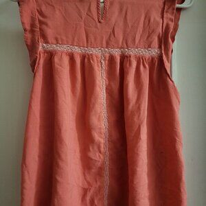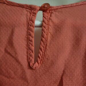 The clothing item is a coral Twik top featuring lace and pintuck details. Twik is an exclusive Canadian fashion brand from the retailer Simons, known for its trend-focused women's apparel. The brand offers various tops, blouses, and dresses in similar styles and colours. See pictures for minor damages
