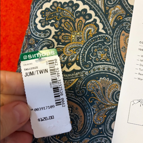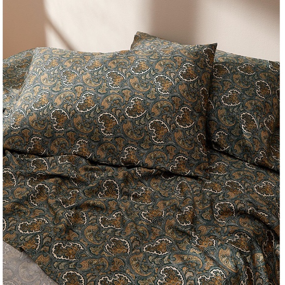 Twin green and brown paisley bamboo rayon sheet set new with tags. Woven with 100% bamboo rayon, 300-thread-count, packaged in a matching, multi-purpose bag. Vibrant colours and exquisite quality!The set includes one flat sheet, one fitted sheet with 13" depth and one standard pillowcase. This item comes from a smoke free, pets friendly home. Recycled bags/box used when possible. Please, let me know if you'd like any additional info. Thanks for looking!