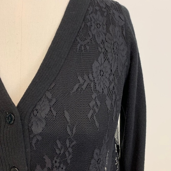 Like new condition, longer length black wool cardigan with beautiful lace overlay. A little fullness in the shape with an asymmetrical hem. The small top button has a very tiny piece missing from the edge. Not noticeable when being worn.