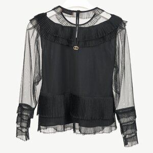 This blouse from Twinset is crafted in a Black tulle, and is embellished with bellow-pleated flounces. It features tight long sleeves, a round neck, a teardrop opening with a button on the back, and is lined in a tonal satin.