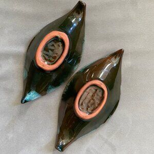 Two BMP Vintage Blue Ceramic Candle-holders tree leaf shaped 6 inch