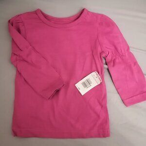 This listing is for two long-sleeve tees for a baby girl, size 6 months. This is the same shirt in two different colours-- one charcoal grey and one "purple orchid," which I would call more of a hot pink/magenta tone. These shirts are 100% cotton, featuring light elastic in the sleeve near the elbow and pin tucks at the shoulders.