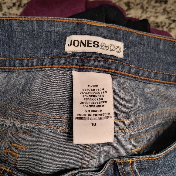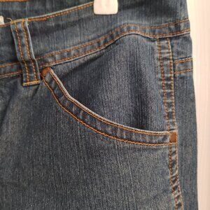 A well kept pair of capris in medium blue with a zipper, two button fasteners and five functional pockets including a watch pocket and two with flaps.