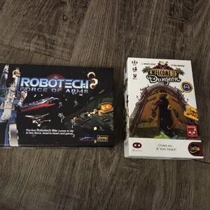 Pair of card games: Robotech Force of Arms card game and Welcome to the Dungeon card game.