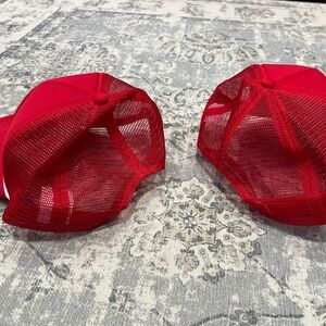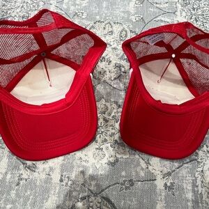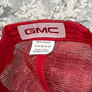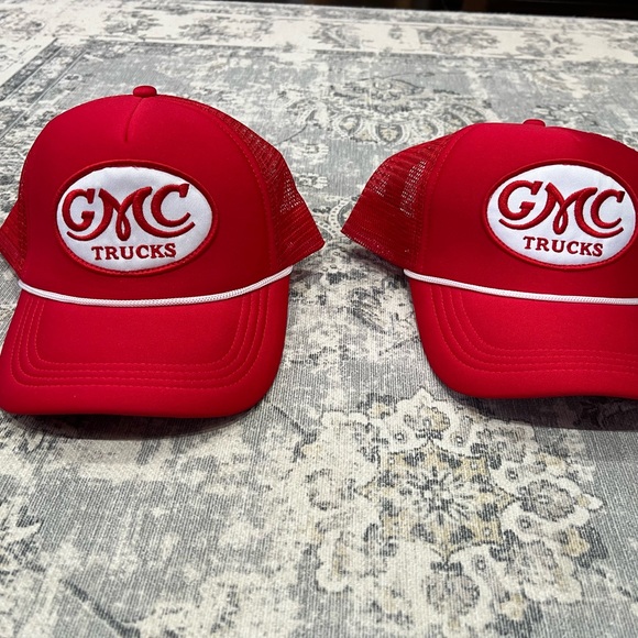 Two red hats with GMC Trucks logo. Features a mesh back for breathability. Unused. Price is total for both hats.