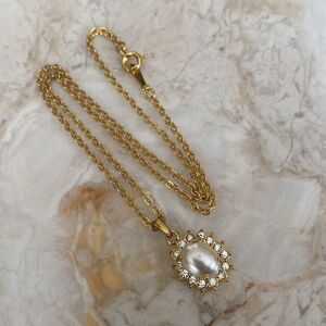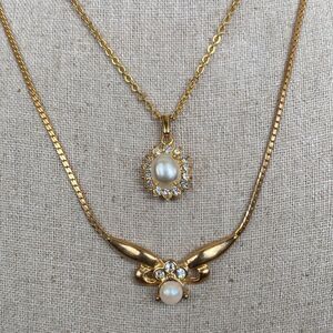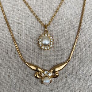 Here are two gold tone Pearl and crystal necklaces, they can be worn separately or together for a layered look.