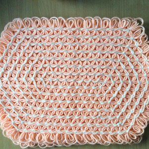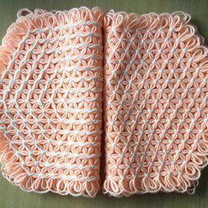 Two Handmade table mats placemats hand-knitted crocheted pink and white yarn hexagon shape.