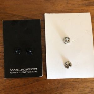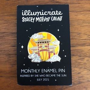 Two Illumicrate pins. First one is a Monthly enamel pin inspired by She Who Became the Sun from July 2021 designed by Stacey McEvoy Caunt, and the second one is called The Huntress inspired by We Hunt the Flame by Hannah Hitchman Illustrations.