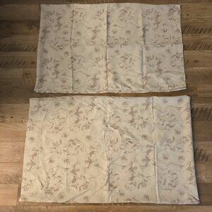 Two very good preowned condition cotton/cotton blend pillow cases featuring brown line drawings of Jurassic Park/World dinosaurs and logo on light beige fabric. Cool illustrative style. 50% cotton and 50% polyester. Washed, but never used.