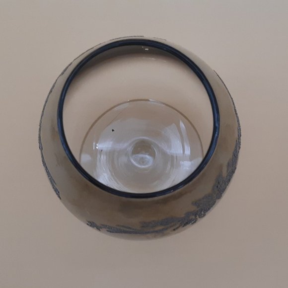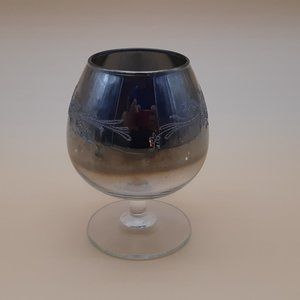 Two neat looking mirrored wine chalices or goblets. They are silver in color, clear near their bottoms, and have gold filigree in a floral/leaf pattern. Note that the background I took the pictures with makes them look even darker than they are; I am unsure of the age but similar listings date these from the 1950s and 60s. There is some wear of the silver; the pair are 4 1/2" tall and 3 at their widest.