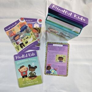 2. Mindful Kids activity set by Whitney Stewart and Mina Braun. 50 cards plus guide book. Minor damage to one corner of case (see photo); cards and booklet inside are in like-new condition.