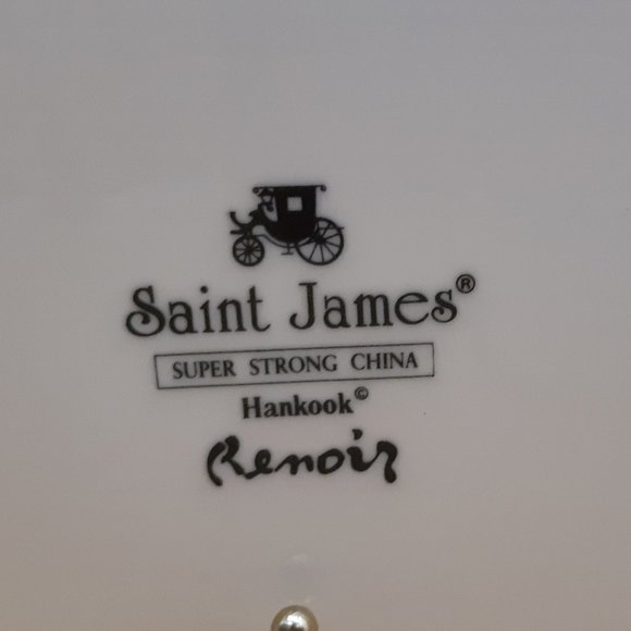 Two pie dishes that probably come to us from the 1980s. The larger dish has an apple pie recipe along with pictures of apples while the smaller has a strawberry pie recipe and, of course, strawberries. They were made by Hankook in their St. James line; the underside also has the marking "Renoir" and notes that it is "Super Strong China" meaning that these dishes are durable. They have crimped edges, one would assume to accommodate a pie crust. Both are in good shape but note that the smaller dish has a chip on its bottom (pic#10).