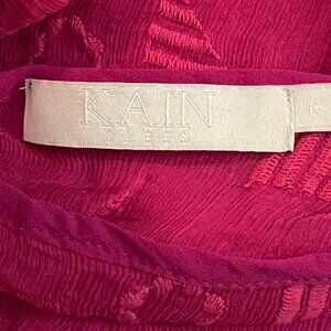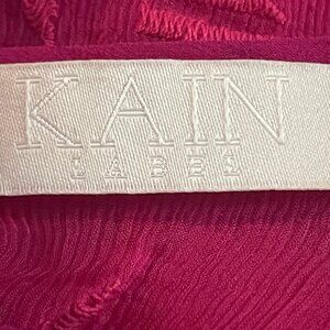 This pretty Kain Label is a 100% Silk Blouse made in the USA. This fuchsia pink top features a unique semi-sheer geometric burnout pattern. Designed with a relaxed fit, a wide boat neckline, and elbow-length sleeves, this blouse offers effortless refinement. The matching silk camisole is a separate piece, allowing for versatile styling—wear the sheer overlay with a tank or long sleeves for a statement look or pair it with the included camisole for a more polished finish. Dry clean only.