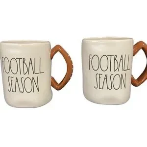 Set of ceramic mugs with 'Football Season' text. Cream body with brown handles by Rae Dunn Price is for two mugs total