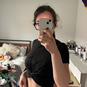 White and black cropped T shirt with a knot on the front and a scrunchy on the back. Can be bought individually or together (1 for $10 or 2 for $15)