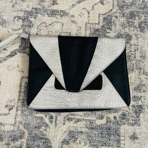 Silver and black faux croc clutch, like new condition. Includes wrist strap. Measures 13 x 9.5 inches.