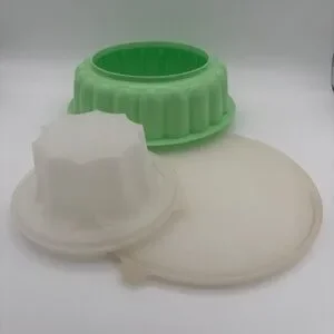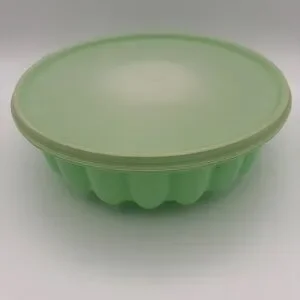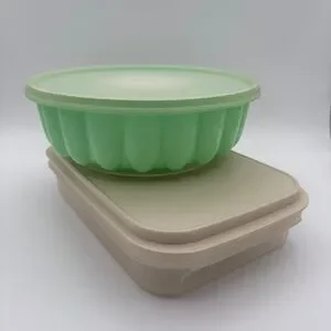 This listing is for two Tupperware sets. The first is a three piece Jello Mold in a mint green colour. This mold has a light green base with a clear fluted insert and a clear lid. The mold measures approximately 9 1/2 inches in diameter in the largest section and about 6 1/4 inches in diameter in the smallest section. It is around 3 1/4 inches high (All measurements are from the assembled piece.) The second set is a Modular Rectangular Server with a lid. This base of this container is clear with an almond colour lid. This piece measures approximately 11 inches by 7 inches. The lid on this container does not snap on like many other Tupperware pieces but just slides over. Please see the pictures.