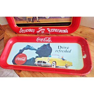Two Vintage Coca Cola Trays "Drive Refreshed" & "Touring Car" 1990