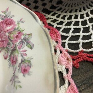 Fair preowned vintage condition, two white dessert plates rimmed in pink roses and verdant green foliage by Johnson Bros of England. Made in England, these are very old, expensive plates. Sadly they are very chewed up in areas with chips and some discoloration. A shame they aren't in better condition. It's a very expensive brand and this set is both old and rare. But if you're looking for cheap, worn, yet decadent plates, here they are. Could be useful as props or a photoshoot.