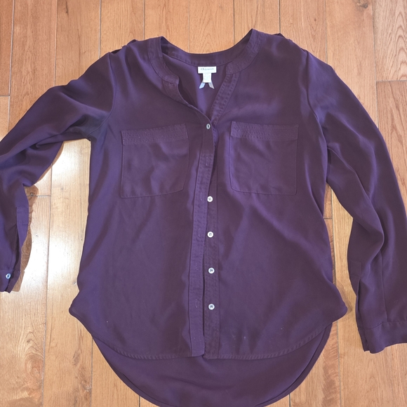 Stylish purple button-up blouse with front pockets. And a stylish striped blouse.