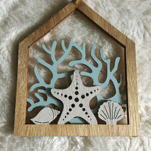 Good preowned condition handmade die cut hanging wood cut décor, featuring coral and fish sea/coastal life with rustic tine. Some wear here and there, but otherwise good. Cute. Free with $50 order.
