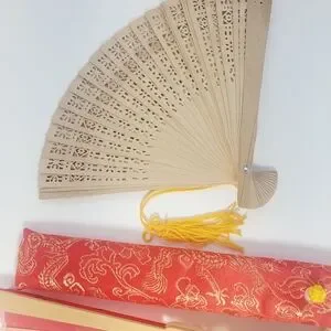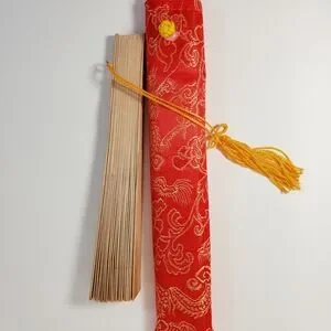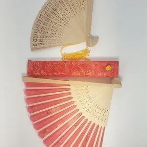 Beautiful hand fans with red and beige design. Perfect for adding a touch of heritage. One has a shiny case, both are in excellent condition.