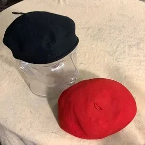 Red vintage felt beret in used vintage condition. Black felt beret in GUC.